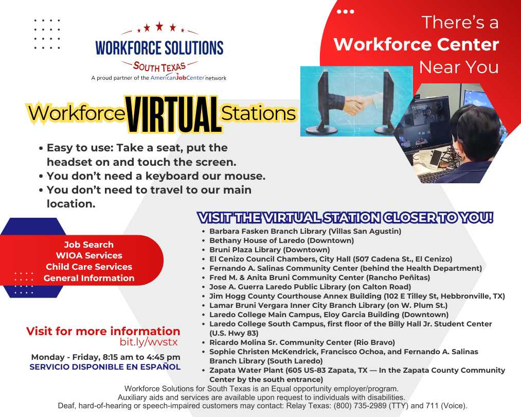 Workforce Solutions for South Texas ofrece una amplia gama de servicios relacionados con el trabajo para ayudarlo a encontrar el trabajo que necesita, incluidas las estaciones virtuales de Workforce en los condados de Jim Hogg, Webb y Zapata.